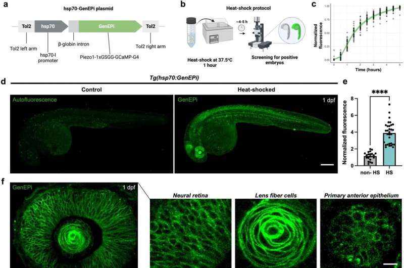 為了對這些通道進行成像,由Periklis Pantazis博士領導的帝國理工學院研究人員開發(fā)了一種高度特異的生物傳感器GenEPi,當Piezo1通道被激活時,它會在顯微鏡下發(fā)光。他們在細胞和整個生物體水平上測試了GenEPi,成功地突出了Piezo1在人類腎臟、包皮、宮頸癌細胞、跳動的小鼠心臟細胞和整個斑馬魚胚胎中的活性。