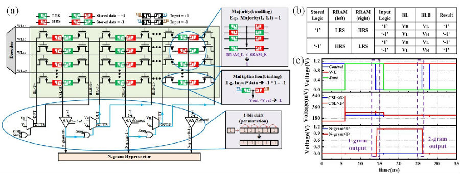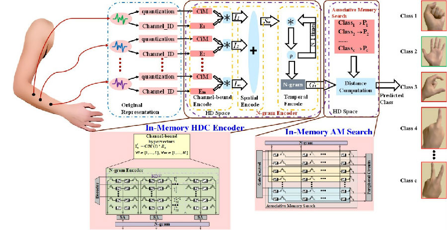 針對這一問題,微電子所微電子器件與集成技術(shù)研發(fā)中心劉明院士團(tuán)隊的尚大山研究員與香港大學(xué)合作,基于阻變存儲器(RRAM)的存內(nèi)計算范式,開發(fā)了面向時空信號處理的存內(nèi)高維計算編碼技術(shù)。團(tuán)隊采用2T2R(兩個晶體管與兩個RRAM為一個單元)陣列作為存內(nèi)高維計算的編碼器,通過在編碼器中原位執(zhí)行綁定和捆綁操作,并通過設(shè)計簡單的外圍電路進(jìn)行重排操作,實現(xiàn)了對時空信號的編碼。該方法利用電阻分壓原理映射超向量的元素,避免了矩陣—向量乘法過程中的陣列會聚電流過大的問題。此外,團(tuán)隊采用1T1R陣列作為關(guān)聯(lián)記存儲器。在訓(xùn)練階段,每個類別編碼后的超向量通過疊加構(gòu)成該類的原型向量,并預(yù)先存儲至關(guān)聯(lián)記憶存儲器中。在推理階段,輸入的時空信號首先被編碼為查詢超向量,然后以存內(nèi)搜索的方式與關(guān)聯(lián)記憶存儲器中的類原型向量進(jìn)行相似度計算。具有最大相似度的類即為預(yù)測結(jié)果。該設(shè)計在基于腦肌電信號的手勢識別任務(wù)中實現(xiàn)了97.96%的識別率。40nm工藝節(jié)點(diǎn)仿真結(jié)果表明該設(shè)計具有高魯棒、高通量、低延時等優(yōu)勢,同時計算能效相較于當(dāng)前的已報道的高維計算編碼器提升了39倍。這項研究結(jié)果為在資源有限的邊緣系統(tǒng)實現(xiàn)對時空信號的實時處理提供了一種高效的解決方案。