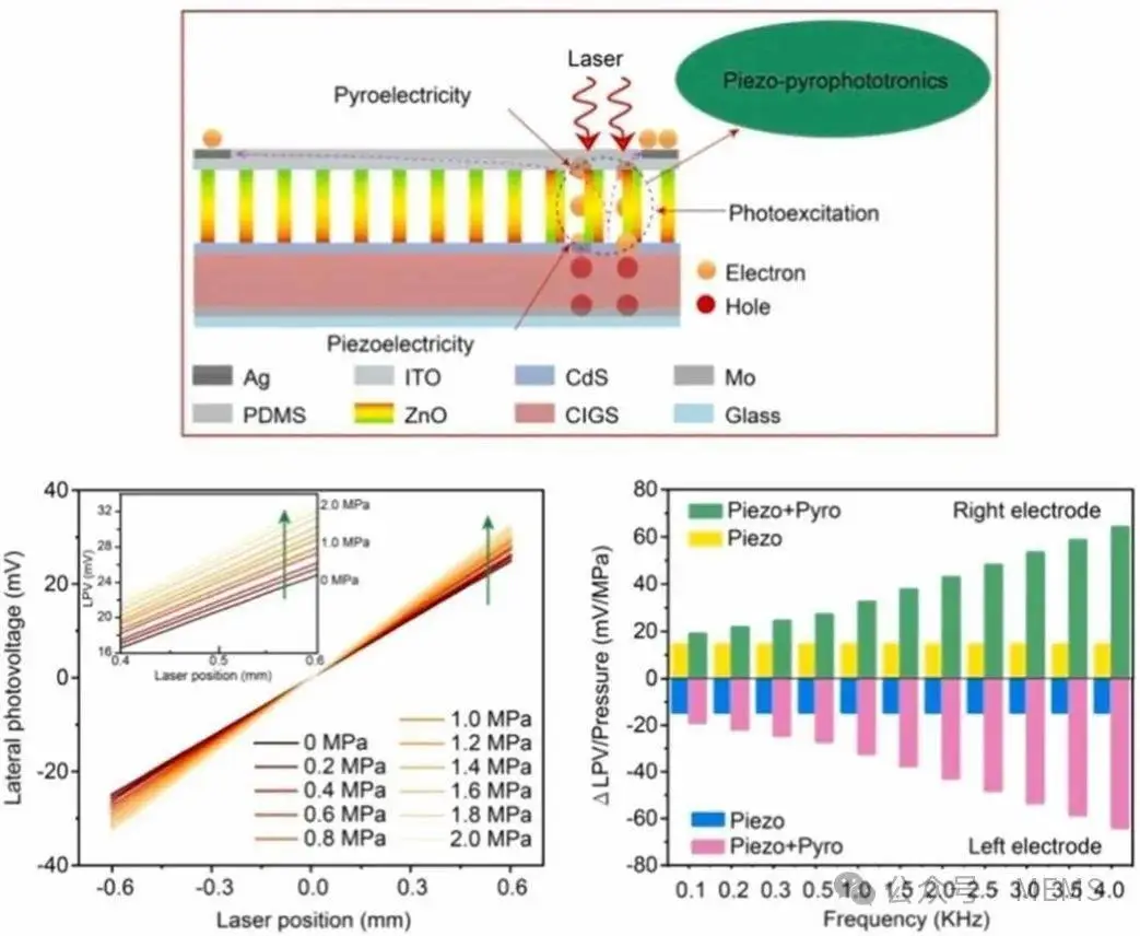 據(jù)麥姆斯咨詢(xún)介紹,河北大學(xué)物理科學(xué)與技術(shù)學(xué)院、河北省光電信息與材料重點(diǎn)實(shí)驗(yàn)室的研究人員提出了一種新型傳感機(jī)制,利用由銅銦鎵硒(CIGS)組成的單片多層異質(zhì)結(jié)來(lái)檢測(cè)壓力。這種傳感機(jī)制結(jié)合了過(guò)剩載流子的光激發(fā)、載流子輸運(yùn)改性的壓電性以及優(yōu)化非均勻光照下橫向光電效應(yīng)(LPE)中光電過(guò)程的熱釋電性。通過(guò)利用產(chǎn)生表面電荷載流子梯度的特殊照明,可誘發(fā)橫向光電壓(LPV),從而展示了傳感器的自供電特性。