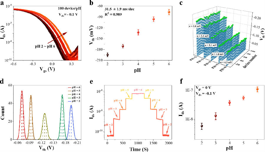 課題組進一步驗證了基于CNT FET的離子傳感器的可重復(fù)性,在每個固定的離子濃度下,所測試的傳感器(100個)閾值電壓的標準偏差在5.1 mV以內(nèi),這意味能夠通過直接測試傳感器的漏極電流來讀取待測溶液的離子濃度信息(圖4)。