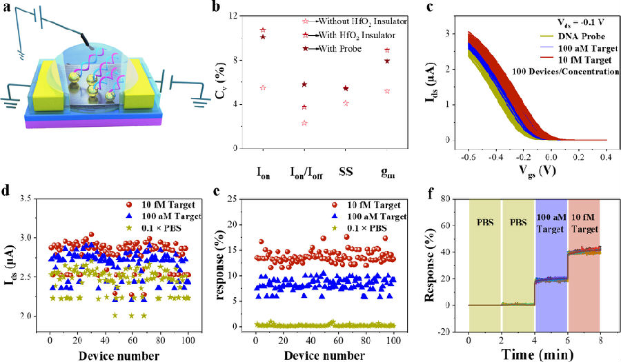 在此基礎(chǔ)上,課題組發(fā)展了CNT FET生物傳感器劃片、封裝的標準工藝流程,并專門開發(fā)了用于FET生物傳感器信號讀出的專用便攜式設(shè)備,可實現(xiàn)生物傳感芯片的即插即用,操作界面友好,非專業(yè)人員亦可根據(jù)簡單的說明書實現(xiàn)生物目標的探測。課題組還展示了通過該便攜式高效檢測系統(tǒng),優(yōu)化檢測方式和數(shù)據(jù)處理方式,CNT FET生物傳感器可在空白背景下檢測濃度低至100 aM的生物信號(圖5)。