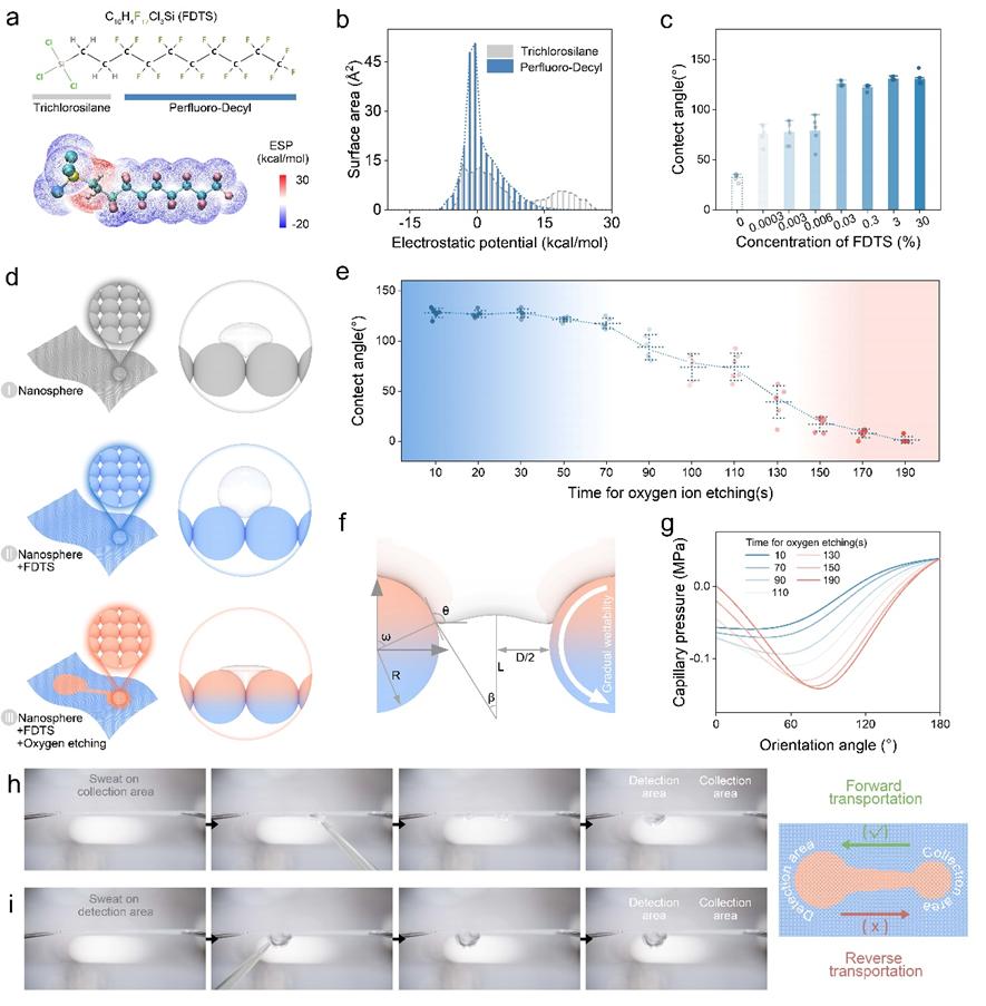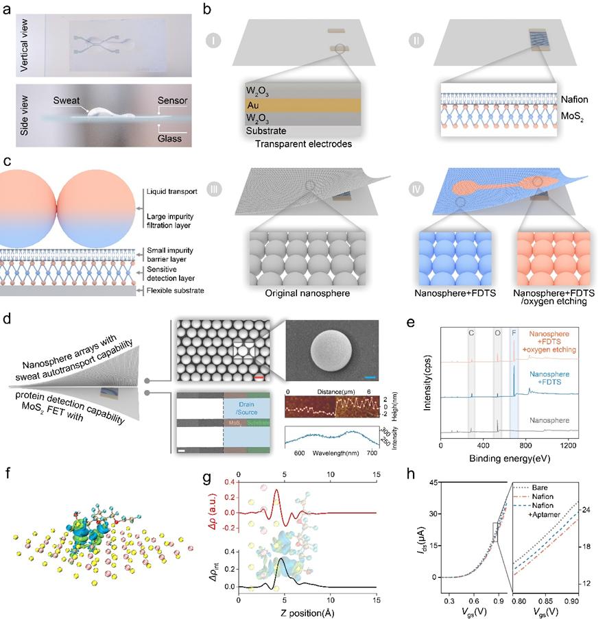 該NM-FET檢測系統(tǒng)主要由兩部分組成:具有逐步潤濕性表面的納米陣列和經(jīng)Nafion/適配體修飾的場效應(yīng)管。納米陣列由直徑為1μm的聚苯乙烯微球組成。經(jīng)全氟葵基三氯硅烷(FDTS)處理和氧離子刻蝕后,納米陣列表面形成親/疏水區(qū)域。納米陣列表面不同區(qū)域的潤濕性變化能夠讓汗液在測試地點(diǎn)實(shí)現(xiàn)自動收集和運(yùn)輸。此外,二硫化鉬場效應(yīng)管部分通過在MoS2材料表面上使用Nafion作為適配體的依附位點(diǎn)進(jìn)行修飾,使得場效應(yīng)管具有可回收性。同時NM-FET的超薄、超柔性基底,能夠承受一定程度的彎曲變形。NM-FET檢測系統(tǒng)通過自動汗液收集/過濾以及真實(shí)汗液中痕量蛋白的高靈敏度檢測,可實(shí)現(xiàn)對人體免疫狀態(tài)變化的實(shí)時監(jiān)測。