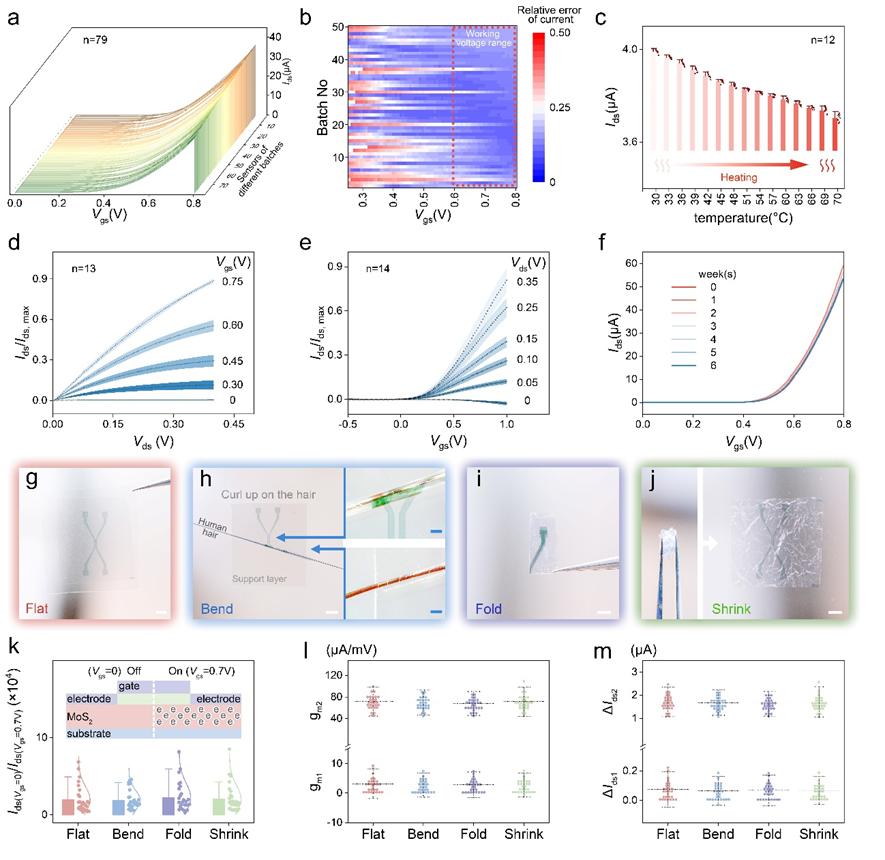 為了評估不同批次NM-FET的性能穩(wěn)定性,測試多個批次場效應(yīng)管傳感器的轉(zhuǎn)移特性曲線,發(fā)現(xiàn)其顯示出較為良好的一致性。為驗(yàn)證人體溫度變化對NM-FET的影響,場效應(yīng)管測試了溫度范圍30°-70°的電學(xué)性能,其轉(zhuǎn)移特性曲線的電流只從3.99 μA降低到3.7 μA。NM-FET在室溫非密封條件下存儲六周,每周測試NM-FET的轉(zhuǎn)移特性曲線,其電流變化率僅為4.42%。以上結(jié)果說明制造批次,溫度以及長時間存儲對NM-FET系統(tǒng)的電學(xué)性能影響較小。為了驗(yàn)證NM-FET柔性基底的抗形變能力,利用彎曲、折疊和皺縮來測試每次變形后NM-FET的電學(xué)特性變化,結(jié)果表明NM-FET在經(jīng)歷形變后仍能保持較高的電學(xué)穩(wěn)定性。