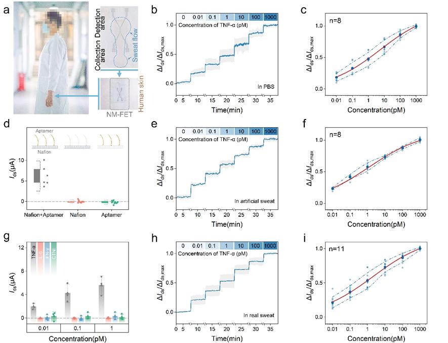 作者將具有逐步潤濕性表面的納米陣列,雜質(zhì)隔離的Nafion隔離層以及超薄、超柔性基底等進(jìn)行結(jié)合,開發(fā)了納米陣列二硫化鉬場效應(yīng)管(NM-FET),具有汗液自動收集運(yùn)輸、雜質(zhì)多層隔離、高靈敏度蛋白檢測以及可重復(fù)使用等多種功能,NM-FET可以有效分析真實(shí)汗液樣品中的TNF-α蛋白濃度,有望在臨床應(yīng)用中實(shí)時監(jiān)測人體汗液中TNF-α蛋白水平。