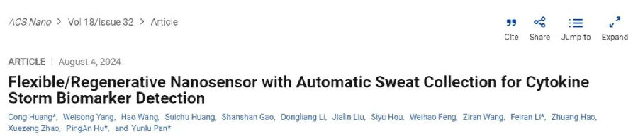 日前,哈爾濱工業(yè)大學(xué)的潘昀路、胡平安教授團(tuán)隊(duì),設(shè)計(jì)開發(fā)了一種具有自動汗液輸送、雜質(zhì)隔離和可重復(fù)使用功能的高靈敏度柔性監(jiān)測系統(tǒng)——納米陣列二硫化鉬場效應(yīng)管(NM-FET)。該系統(tǒng)將具有逐步潤濕性表面的納米陣列和用Nafion/適配體修飾的場效應(yīng)管傳感器進(jìn)行集成,該系統(tǒng)可檢測真實(shí)汗液中10fM~1nM范圍變化的TNF-α蛋白濃度。相關(guān)工作以“Flexible/Regenerative Nanosensor with Automatic Sweat Collection for Cytokine Storm Biomarker Detection”為題發(fā)表在《ACS Nano》,并被選為當(dāng)期封面。文章共同第一作者為哈爾濱工業(yè)大學(xué)機(jī)電工程學(xué)院助理研究員黃聰、2023級博士生楊煒嵩、2021級博士生王昊、2018級博士生黃穗楚。