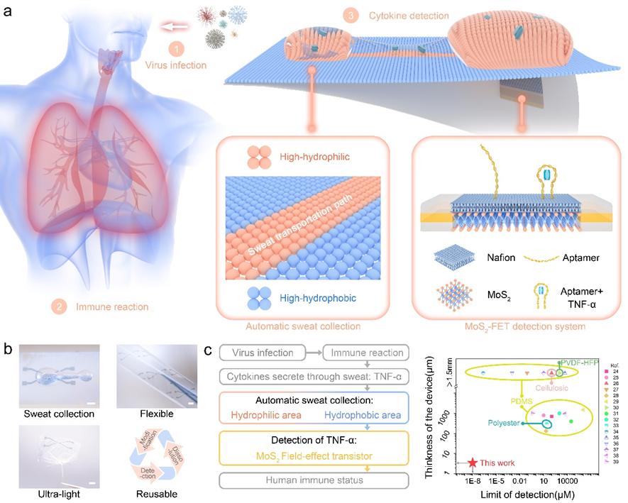 細(xì)胞因子是協(xié)調(diào)人體免疫反應(yīng)的關(guān)鍵蛋白,廣泛存在于血液和組織液等內(nèi)分泌液以及唾液和汗液等外分泌液中,是臨床評估患者健康狀況的重要生物標(biāo)志物。在呼吸系統(tǒng)疾病中,病毒通過呼吸道進(jìn)入人體后,免疫系統(tǒng)分泌各種調(diào)節(jié)炎癥的細(xì)胞因子,能夠刺激、集中和擴(kuò)增免疫細(xì)胞。TNF-α作為一種典型的促炎類型細(xì)胞因子,在人體的免疫反應(yīng)中尤為重要。通過監(jiān)測汗液中的TNF-α濃度,可以有效地評估機(jī)體的免疫狀態(tài)。傳統(tǒng)的檢測方法,例如免疫熒光法和酶聯(lián)免疫吸附法,往往需要復(fù)雜的操作和較長的時間進(jìn)行檢測,限制了其大規(guī)模應(yīng)用。因此,發(fā)展可穿戴傳感器,實(shí)現(xiàn)對于痕量蛋白的檢測,成為新的研究熱點(diǎn);诙S材料(如MoS2和石墨烯)的場效應(yīng)晶體管傳感器因其無標(biāo)記、快速響應(yīng)和高靈敏度等優(yōu)點(diǎn)而備受關(guān)注,在人體代謝物和離子檢測方面得到了初步應(yīng)用。然而,在真實(shí)的檢測中,人體外分泌液(如汗液)中雜質(zhì)分子的存在會嚴(yán)重干擾痕量蛋白的有效檢測。因此,開發(fā)能夠直接檢測未稀釋汗液中細(xì)胞因子的可穿戴設(shè)備成為臨床研究的焦點(diǎn)。