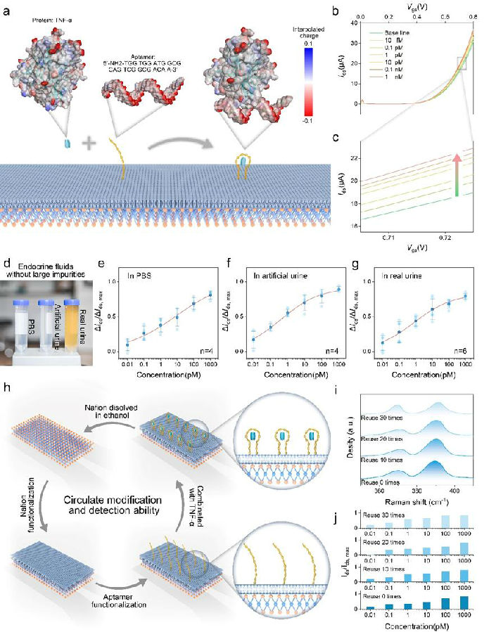 在真實(shí)檢測中,人體外分泌液中雜質(zhì)分子的存在會嚴(yán)重干擾蛋白的有效檢測。為了證實(shí)該檢測系統(tǒng)在不同溶液中的檢測能力,NM-FET分別在磷酸鹽緩沖溶液(PBS)、人工尿液和真實(shí)尿液中檢測,均表現(xiàn)出較為出色的檢測能力。適配體和蛋白結(jié)合后通常無法自行分離,因此大多數(shù)基于適配體檢測的傳感器是一次性的。而如果可將傳感區(qū)域進(jìn)行回收處理,即可實(shí)現(xiàn)傳感器的重復(fù)利用。由于Nafion可溶于酒精,將使用過的NM-FET浸入酒精,MoS2通道表面的Nafion溶解,即可恢復(fù)到原始MoS2通道狀態(tài)。隨后使用Nafion和適配體進(jìn)行另一輪修飾,可恢復(fù)NM-FET的檢測能力。對NM-FET進(jìn)行30次循環(huán),每10次循環(huán)后測量MoS2表面的拉曼光譜,并使用修飾后的NM-FET進(jìn)行TNF-α濃度檢測。結(jié)果表明NM-FET可循環(huán)使用30次檢測周期,這有效提高了檢測系統(tǒng)的資源利用效率。