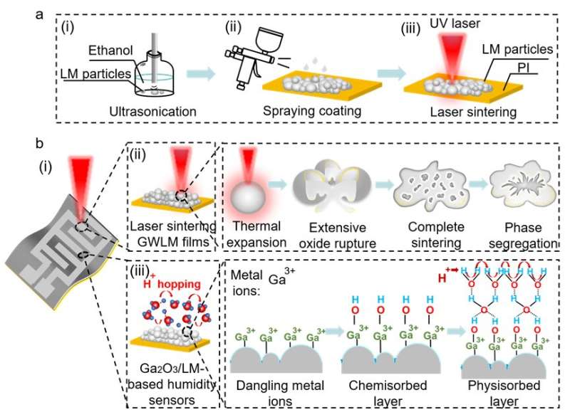 柔性電容式濕度傳感器的設(shè)計(jì)與制造。(a) 柔性 Ga₂O₃/ 液態(tài)金屬(LM)濕度傳感器的制造過(guò)程,包括超聲處理、噴涂和激光燒結(jié)。(b) 通過(guò)激光燒結(jié)形成 GWLM(氧化鎵包裹液態(tài)金屬)薄膜的機(jī)理以及基于 Ga₂O₃/LM 的濕度傳感器的傳感機(jī)理示意圖。圖片來(lái)源:《光電子進(jìn)展》(2023 年)。DOI: 10.29026/oea.2023.220172