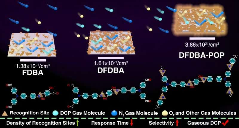 研究中,團隊通過調(diào)控分子鏈長度,設(shè)計合成了一系列零背景熒光席夫堿材料(FDBA、DFDBA、DFDBA-POP),其 C=N 鍵作為識別位點的密度可通過分子結(jié)構(gòu)調(diào)控。實驗表明,增加 C=N 鍵密度和比表面積能顯著提升與 DCP 的碰撞效率,縮短響應(yīng)時間。