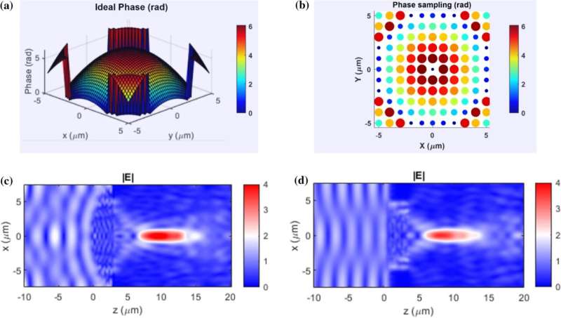 (a)微透鏡所需的理想連續(xù)相剖面(λ = 4.25 μm,f = 9 μm,n = 2.7),可被球面透鏡準確復制;(b)由排列為1 μm間距的超原子離散采樣,如圖所示,單層平面金屬中具有不同直徑。所得的電場強度(|E|)輪廓分別在球面透鏡和金屬透鏡的(d)中顯示,金屬透鏡相比球面透鏡的對焦效率較低。圖片來源:電子材料雜志(2025年)。DOI:10.1007/s11664-025-12115-y