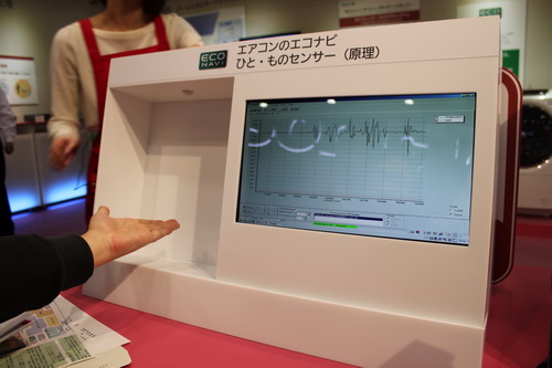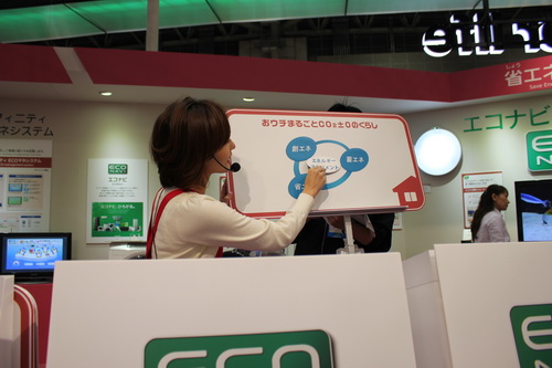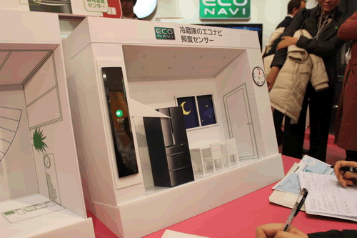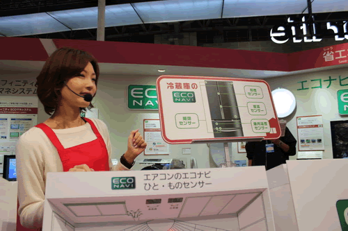 首先我們來到了家庭總體展示區(qū),這里展示裝配了“Eco NAVI”的最新的節(jié)能家電陣容。此外,還可以在這里親身體驗實現(xiàn)了“Eco NAVI”的“亮度傳感器”和“人·物傳感器”。這里還展示了創(chuàng)能的“家用燃料電池”、“太陽能電池HIT®”,蓄能的“家用鋰電池”,能源管理的“Lifinity”、“SEG(智能能源閥門)”,以及住宅用的“EV(新能源汽車)”相關(guān)措施等。當(dāng)然,和我們?nèi)粘I钭顬橘N近的還是冰箱、空調(diào)等家電產(chǎn)品,有一位美麗的講解員小姐正在上課哦,和記者一起聽聽吧。