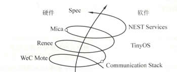 圖中描述了演示平臺螺旋式上升的無線傳感器節(jié)點軟硬件發(fā)展歷程。由于該平臺的硬件和軟件都是公開的,所以其成為研究傳感器網(wǎng)絡(luò)的最主要的試驗平臺。Mica系列節(jié)點包括Wec、Renee、Mica、Mica2dot和Spec等,其中Mica和Micadot節(jié)點已經(jīng)由Crossbow (1995年成立,專業(yè)從事無線傳感器產(chǎn)業(yè)的公司)公司包裝生產(chǎn)。
