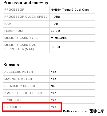 在摩托羅拉的開發(fā)者頁面中,摩托羅拉給出了Xoom的詳細配置,其中傳感器芯片中竟然出現(xiàn)了氣壓感應(yīng)裝置,這在手機和平板機設(shè)備中非常少見。這種感應(yīng)裝置可以通過對周圍的氣壓進行感測,從而提供更準確的天氣信息以及所處高度。
