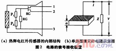 如圖2(a)所示:RE200B有兩個(gè)敏感單元P1、P2。這兩個(gè)特征一致的熱電元反向串聯(lián)或接成差動(dòng)平衡電路方式,較之單熱電元的結(jié)構(gòu)(圖2(b)),不僅可以使輸出的信號(hào)具有方向性,還可以抑制因自身溫度變化而產(chǎn)生的干擾。工作時(shí),當(dāng)人體從圖中箭頭所指的兩個(gè)不同方向經(jīng)過(guò)探測(cè)視場(chǎng)時(shí),由于兩個(gè)熱敏元件接收到的紅外熱輻射的先后次序恰好相反,使得熱敏元件表面的正負(fù)電荷由平衡到不平衡,再到平衡的交變過(guò)程在整體上也相反,這時(shí)就會(huì)有兩種相位相反的交變信號(hào)電壓輸出。它們反映人體的進(jìn)、出行走方向。