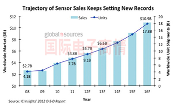 20世紀(jì)90年代后期以來(lái),傳感器市場(chǎng)只遭遇過(guò)一次下跌,即2009年,市場(chǎng)營(yíng)收跌幅為2%。不過(guò),2010年的復(fù)蘇來(lái)得極為猛烈,整體市場(chǎng)暴漲53%。2012年O-S-D 報(bào)告顯示,2011年的固態(tài)傳感器市場(chǎng)增長(zhǎng)幅度達(dá)到21%。預(yù)計(jì)2011年到2016年間,全球傳感器銷(xiāo)售額的復(fù)合年均增長(zhǎng)率(CAGR)達(dá)18%,2016年?duì)I收將達(dá)到109億美元。