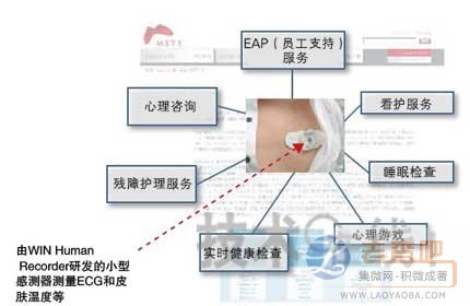 而日本大商社丸紅的子公司丸紅系統(tǒng)開展了一項(xiàng)利用小型傳感器可同時(shí)測(cè)量使用者心電(ECG)、體表溫度及體動(dòng)的保健服務(wù)(圖2)。2010年1月,與開發(fā)所利用傳感器的WIN Human Recorder公司簽訂了銷售代理合約,據(jù)稱3年后的銷售目標(biāo)是每年50億日元。