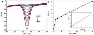 圖3. (A),OMCs/GCE在不同濃度對(duì)氧磷溶液(PBS緩沖液, pH6.0)的DPV圖。DPV測(cè)定參數(shù):平衡時(shí)間2s; 電位幅度, 50 mV; 脈沖周期,0.5s; 階躍高度, 4 mV; 頻率, 60 Hz。(B),濃度-電流曲線,內(nèi)插圖為10-200 nM區(qū)間內(nèi)的放大圖。
