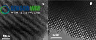 圖1. OMCs透射電鏡照片。(A)介孔隧道結(jié)構(gòu),(B)沿[001]方向照片。