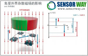 圖2 微分傳感技術(shù)可使設(shè)備不受雜散磁場(chǎng)的影響。圖中下部為4個(gè)霍爾傳感器。