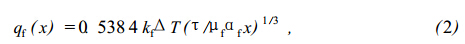 式中X為流過熱源表面的距離,m+ kf為流體的熱導(dǎo)率, W.K-1.m-1,為黏度系數(shù),kg m-1 s- + af為熱擴散率,