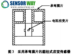 另外在實際測量中,被測力不可能正好沿著圓柱體的軸線作用,而總是與軸線之間有微小的角度或偏心,使得彈性體除了受縱向力作用以外,還受到橫向力和彎矩的作用,帶來非線行誤差。為了消除橫向力 的影響,可采用圖3所示的承彎膜片結(jié)構(gòu)。