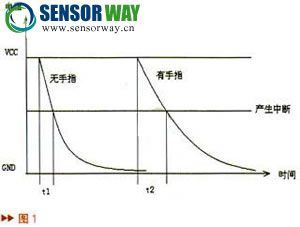 使用PCB焊盤(pán)作為觸摸按鍵,和地之間構(gòu)成一個(gè)小電容C1(沒(méi)有手指觸摸時(shí)),按鍵通過(guò)大阻值電阻R1接地。單片機(jī)端口平時(shí)輸出高電平,檢測(cè)按鍵時(shí)則為鍵盤(pán)中斷,隨著C1上的電荷通過(guò)R1流失,電平逐漸降低直至引起鍵盤(pán)中斷,從開(kāi)始檢測(cè)到引起鍵盤(pán)中斷的時(shí)間為T(mén)1,當(dāng)有手指觸摸時(shí)相當(dāng)于在C1上并了一個(gè)電容,因此電容值變成C2,則從開(kāi)始檢測(cè)到引起鍵盤(pán)中斷的時(shí)間為T(mén)2,通過(guò)檢測(cè)T1、T2的差別即可判斷按鍵按下,如圖1。