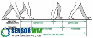 用戶在水平步行運(yùn)動(dòng)中,垂直和前進(jìn)兩個(gè)加速度會(huì)呈現(xiàn)周期性變化,如圖所示。在步行收腳的動(dòng)作中,由于重心向上單只腳觸地,垂直方向加速度是呈正向增加的趨勢(shì),之后繼續(xù)向前,重心下移兩腳觸底,加速度相反。水平加速度在收腳時(shí)減小,在邁步時(shí)增加。
