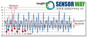 人體最快的跑步頻率為5HZ,也就是說相鄰兩步的時(shí)間間隔的至少大于0.2秒,如圖所示,我們?cè)O(shè)置了timespan在記步過程中我們過濾了高頻噪聲,即步頻過快的情況。同時(shí)我們通過和上次加速度大小進(jìn)行比較,設(shè)置設(shè)立一定的閥值Threshold來(lái)判斷運(yùn)動(dòng)是否屬于有效,有效運(yùn)動(dòng)才可進(jìn)行記步。