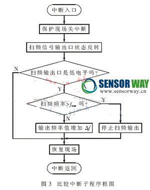 單片機PIC16F873A內(nèi)帶有捕捉/比較模塊,用比較模式產(chǎn)生掃頻信號十分方便。當要輸出掃頻激振信號時,首先使選擇的通道號對應的MOSFET固態(tài)繼電器導通,而使其他通道的MOSFET固態(tài)繼電器截止處于高阻狀態(tài);其次,將捕捉/比較模塊設置在比較模式下,把掃頻信號頻率的下限值fmin送到16 bit的比較數(shù)據(jù)寄存器中,清零定時器1的數(shù)據(jù)寄存器并啟動定時器1開始定時計數(shù)。這時,比較數(shù)據(jù)寄存器中的值不斷與定時器1數(shù)據(jù)寄存器的值比較,當兩者相等時產(chǎn)生一個比較中斷。在比較中斷子程序中主要完成以下任務:(1)掃頻信號輸出口電平反轉(zhuǎn);(2)輸出掃頻信號的頻率增加一個步距Δf;(3)將輸出信號頻率與掃頻的上限頻率值fmax比較,當掃頻的頻率值高于上限頻率fmax時,停止掃頻輸出。用比較模式產(chǎn)生掃頻信號的比較中斷子程序框圖如圖3所示。