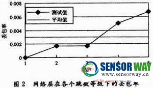 (6)測試結(jié)果評估:網(wǎng)絡(luò)層在各個跳數(shù)等級下的丟包率隨節(jié)點跳數(shù)增加而增加,平均丟包率為0.3%。