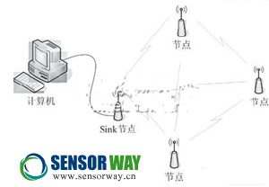 針對環(huán)境及結構狀態(tài)監(jiān)測,我們設計了一種通用無線傳感器網(wǎng)絡硬件平臺,該硬件平臺由若干傳感器節(jié)點、具有無線接收功能的Sink節(jié)點及一臺計算機構成。無線傳感器節(jié)點分布于需要監(jiān)測的區(qū)域內,執(zhí)行數(shù)據(jù)采集、處理和無線通信等工作,Sink節(jié)點接收各傳感器的數(shù)據(jù)并以有線的方式將數(shù)據(jù)傳送給計算機,如圖2所示。