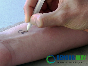 生物傳感器過(guò)皮膚讀取血糖指數(shù),并通過(guò)藍(lán)牙設(shè)備傳出結(jié)果。一支筆里的墨水可以寫(xiě)滿(mǎn)500張血糖傳感條。