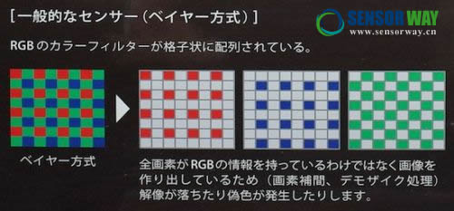 傳統(tǒng)拜耳傳感器的色彩濾波陣列(CFA),設(shè)計在2 X 2像素單元中分別有一個像素的紅色,一個像素的藍(lán)色和兩個像素的綠色顏色濾鏡,通過不斷重復(fù)這些單元組成陣列。使用拜耳傳感器的相機(jī)必須通過插值的方法填補(bǔ)失去的顏色和亮度信息,這將導(dǎo)致分辨率下降和出現(xiàn)偽色等問題。
