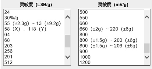 靈敏度(LSB/g<)主要針對數(shù)字輸出加速度傳感器,代表一個重力加速度(g)下,輸出能區(qū)分多少位LSB。上面已經(jīng)根據(jù)應(yīng)用要求推導(dǎo)出,假設(shè)應(yīng)用要求最小分辨率為1°,靈敏度需要大于58LSB/g。那么可以根據(jù)這一結(jié)果直接在參數(shù)欄里選擇。