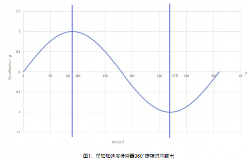 對于單軸加速度傳感器,加速度傳感器的輸出為Ax=sin(θ)*1g,如果檢測軸與重力平面沒有很好的對齊,會影響重力加速度在檢測軸上的分量,從而影響檢測精度。