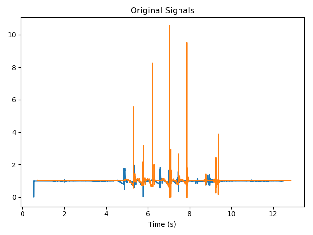 現(xiàn)在我們有兩個(gè)具有相同采樣率的信號,我們必須確定兩次記錄開始之間的時(shí)間偏移。這個(gè)問題可以被定義為尋找最佳信號一個(gè)偏移噸 ∈( - LEN(信號 1),LEN(信號 2))? ?由一些度量,其最好的同步重采樣信號。我們還允許用戶指定兩個(gè)信號之間的最大起始時(shí)間偏移,以防止由一個(gè)信號中的最后幾個(gè)采樣與另一個(gè)信號中的前幾個(gè)采樣很好地同步引起誤報(bào)的可能性。