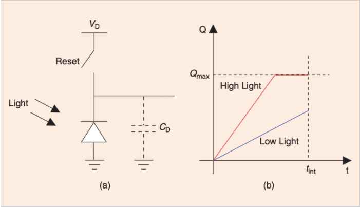 請注意,阱容量Qwell設(shè)置CD可以容納的電荷量的上限。超過一定的光強度時,二極管將飽和,并且累積電荷將等于上圖所示的最大值。因此,必須仔細(xì)選擇整合期。
