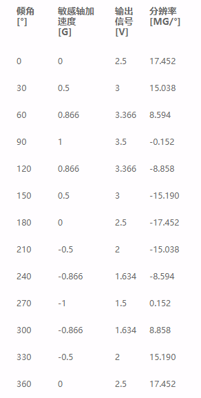 在本例中,加速度傳感器圍繞X軸或Y軸旋轉(zhuǎn)360°。表一顯示了相應(yīng)的角度[°], 通過敏感軸得到的加速度[g], 輸出信號 [V], 和分辨率 [mg/°] 。從分辨率對角度的關(guān)系中,我們可以清楚地看到,盡管加速度傳感器可以在360°以上的范圍內(nèi)提供信號,它的最佳的工作區(qū)域是在 0°和180°附近±30°的線性和對稱區(qū)間。