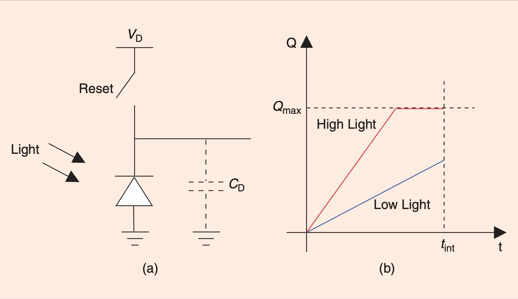 復位開關在曝光周期開始時閉合,以將光電二極管反向偏置到電壓 VD。接下來,開關打開并產(chǎn)生與入射光強度成比例的光電流。該電流在毫微微安培到微微安培范圍內(nèi),并且太小而無法直接測量。如果我們讓光電二極管暴露在光線下一段設定的時間,著色,電流將在二極管電容 CD 上積分。存儲的電荷為我們提供了更容易測量的更強的累積信號。此外,所包含的平均過程使累積的信號更忠實地表示測量的光強度,尤其是在處理微弱或嘈雜的信號時。