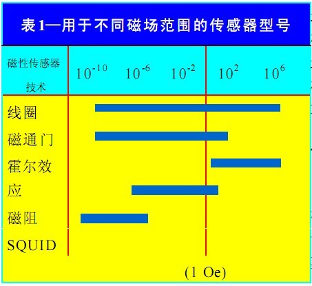 磁場測量可分為三個(gè)范圍。在每個(gè)范圍中,能在其環(huán)境中處于最佳工作狀態(tài)的磁性傳感器型號也不同。第一個(gè)磁場范圍遠(yuǎn)大于地球磁場(如在永久磁鐵或大電流附近)。其范圍為 100 奧斯特(Oe) 或更高。第二個(gè)磁場范圍約等于地球磁場或0.6 Oe 。第三個(gè)磁場范圍遠(yuǎn)遠(yuǎn)小于地球磁場,它們在 1 mOe 或更低范圍內(nèi)。地球磁場常用作受鐵磁物體干擾的背景磁場,如在磁異態(tài)檢測中的鐵磁物體。表 1 給出了用于不同磁場范圍的傳感器型號 。