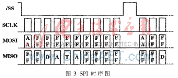 SPI接口中,LPC2136作為主控端,MLX90316作為從屬端。SPI通信模塊主要讓LPC2136讀取MLX90316的磁敏角度,SPI的通信過程為:主控端先輸出一個0xAA以及一個0xFF作為通信起始信號,接著輸出8個0xFF,而從端會同時輸出2個0xFF、4 B的角度信號以及4個0xFF,從而完成一次數(shù)據(jù)通信。具體的通信時序如圖3所示。