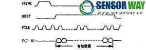 VSYNC是垂直場同步信號(hào)(也是每幀同步信號(hào),CMOS是按列采集圖像的),其下降沿表示一幀圖像的開始,HREF提供了一種有效的控制方式,當(dāng)輸出像素行列分別處于設(shè)定窗口之間時(shí)HREF為有效高電平,此時(shí)輸出有效的視頻數(shù)據(jù),PCLK是輸出數(shù)據(jù)同步信號(hào),上升沿輸出一個(gè)有效的像素Y[7∶M].