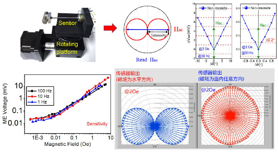 近日,電子科學(xué)與工程學(xué)院劉明教授課題組設(shè)計了一種基于“磁扭電”效應(yīng)的新型磁場傳感器,該傳感器采用了一種全新的力-電耦合結(jié)構(gòu),能夠?qū)⒋排ぞ剞D(zhuǎn)化成應(yīng)力,并施加在壓電材料上,實現(xiàn)了磁場作用下電信號的輸出。該器件的結(jié)構(gòu)通過有限元仿真軟件優(yōu)化后,可以有效去除干擾信號,顯著提高輸出信號的純度;同時,力-電耦合結(jié)構(gòu)可顯著改善輸出信號對探測方向的敏感性,理論上,磁敏感方向與非敏感方向的輸出信號強度比值可以為“無窮大”倍;凇按排る姟毙(yīng),課題組開發(fā)了可用于二維平面磁場大小和方向探測的磁電羅盤,該傳感器可同時測量面內(nèi)交流磁場的強度和方向,強度精度為0.01 Oe(約為地磁場大小的1/50~1/60),方向的角度精度為±0.2o,解決了如何同時高精度地測量磁場的強度和方向這個難點問題,在工業(yè)設(shè)備的磁場測定、校準、監(jiān)測中具有巨大的應(yīng)用前景。此外,該器件是一種理想的無源器件,無需供電、無需偏置磁場、無需校正算法、無需信號放大模塊,驅(qū)動簡單,幾乎無能耗,精度高,靈敏度高(輸出可以達到幾十到幾百mV/Oe),結(jié)構(gòu)強度高,工作頻率范圍廣(幾Hz到幾百Hz),成本優(yōu)勢明顯,有望在工業(yè)生產(chǎn)、國計民生、電力系統(tǒng)、物聯(lián)網(wǎng)等領(lǐng)域獲得大規(guī)模應(yīng)用。