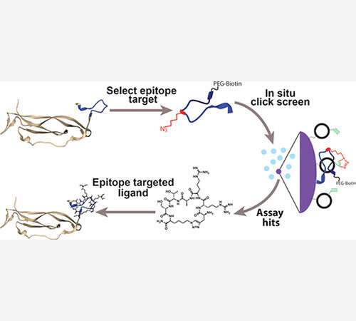 通過使用大型肽庫,對蛋白質(zhì)靶標(biāo)進(jìn)行廉價,高度穩(wěn)定和模塊化的基于肽的合成親和劑(PCC)的快速開發(fā)過程。信用:經(jīng)Heather D. Agnew等的許可轉(zhuǎn)載。
