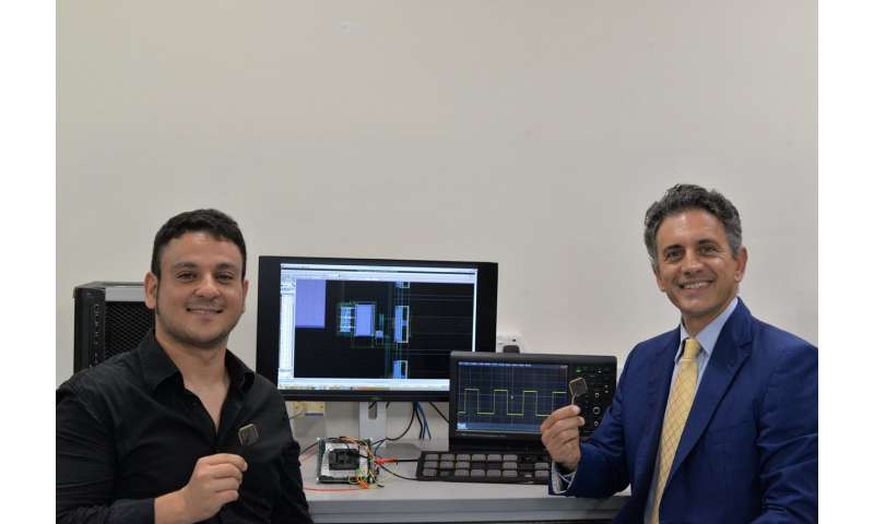 NUS研究人員發(fā)明了一種低成本的“無(wú)電池”喚醒定時(shí)器,可將IoT傳感器節(jié)點(diǎn)的功耗降低1000倍,從而有助于持久運(yùn)行。 喚醒定時(shí)器嵌入在測(cè)試芯片中,并放置在較大的封裝中(由兩個(gè)研究人員持有),以便于測(cè)試和表征。 左起:新加坡國(guó)立大學(xué)工程學(xué)院的Orazio Aiello博士和Massimo Alioto副教授學(xué)分:新加坡國(guó)立大學(xué)
