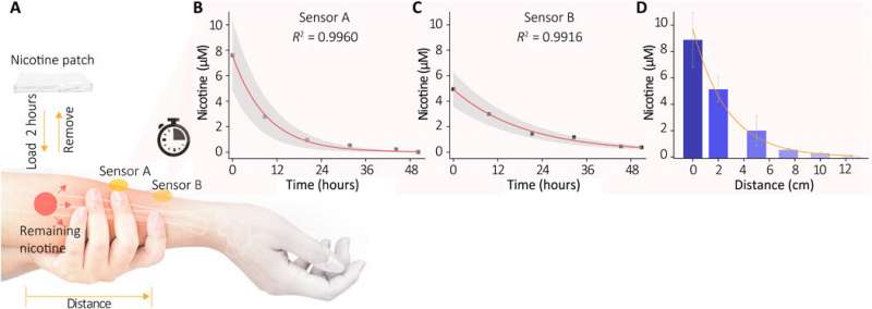 人體皮膚中尼古丁代謝過程的體內(nèi)監(jiān)測。(A)實驗的示意圖。將包含?10 mg的尼古丁貼劑貼在志愿者的前臂上2小時,然后將其取出。徹底清潔皮膚后,我們的傳感器會提取并分析皮膚中殘留的尼古丁。(B和C)從兩個位置(傳感器A直接位于修補區(qū)域;傳感器B連接約2厘米)測量了剩余尼古丁濃度的變化。在出汗20分鐘(0.5 mA離子電滲療法電流,10%乙酰膽堿氯化物負(fù)載的水凝膠)抽出20分鐘后進(jìn)行每次測量,并連續(xù)收集接下來10分鐘的傳感器響應(yīng)。圖中顯示了獲得的平均尼古丁水平。陰影區(qū)域表示測量值的±SD。(D)貼劑后抽出的汗液中尼古丁濃度的距離依賴性。六個傳感器沿著手臂放置在距修補區(qū)域0到12.5 cm的距離處。圖片來源:Science Advances,doi:10.1126 / sciadv.abe4553