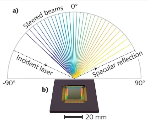 基于相同的原理,LCM 是反射式一維超表面,利用諧振亞波長元件的液晶調(diào)諧。在該方案中,每個諧振器的相位延遲與施加到它的電壓成正比,這會局部旋轉(zhuǎn)液晶,改變諧振波長并實現(xiàn) 120° 視場和整個視場的均勻效率。