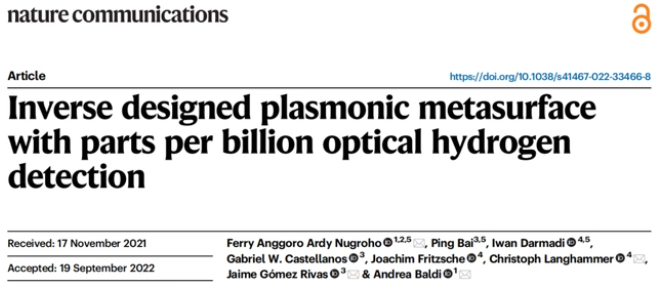 1.Nugroho, F.A.A., Bai, P., Darmadi, I. et al. Inverse designed plasmonic metasurface with parts per billion optical hydrogen detection. Nat Commun 13, 5737 (2022). https://doi.org/10.1038/s41467-022-33466-8