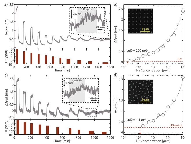 等離子體氫氣傳感器,是 Nature Communications 那篇論文的的研究對(duì)象。這種傳感器主要依賴于金屬納米顆粒中的光學(xué)共振。該類共振通常具有非常寬的光譜,所以傳統(tǒng)氫氣傳感器的檢測(cè)僅在百萬(wàn)分之一。