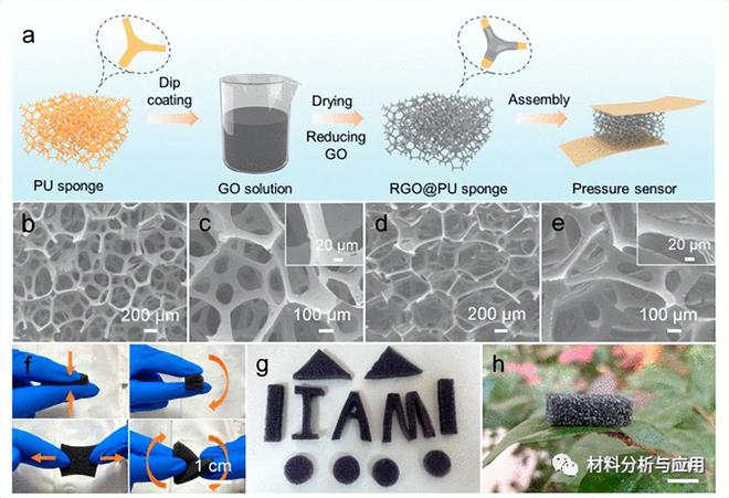 圖1. (a) RGO@PU海綿傳感器的制備示意圖。(b,c)原始PU海綿和(d,e)RGO@PU海綿的SEM表面形貌圖像。(f) RGO@PU海綿在不同變形狀態(tài)下的照片。(g) 照片顯示RGO@PU海綿很容易被切割成不同形狀的標本。(h) RGO@PU海綿放在綠葉上。